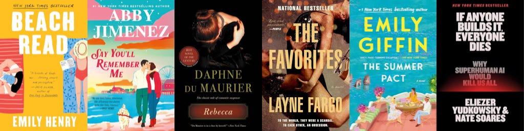 Karyn: In preparation for writing the romance novel with Jen, I downloaded a bunch of popular books. First up is Say You’ll Remember Me by Abby Jimenez and Beach Read by Emily Henry—two books everyone seems to love. I’m curious to see where they land on the spectrum when it comes to LOVE MAKING. (I will say, I’m half way through Say You’ll Remember Me, and tone-wise it seems like what we used to call “chick lit.” Are romance novels today really just rebranded chick lit? Because the chick lit label seems to have disappeared.)